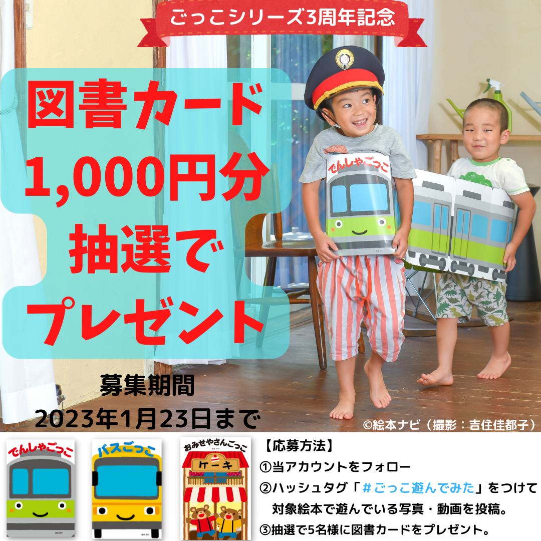 【本の中に入って読む絵本『ごっこ』シリーズ3周年記念】対象の絵本で遊んでいる写真や動画を投稿いただいた方の中から抽選で図書カードが当たる「#ごっこ遊んでみた」キャンペーンを開催!