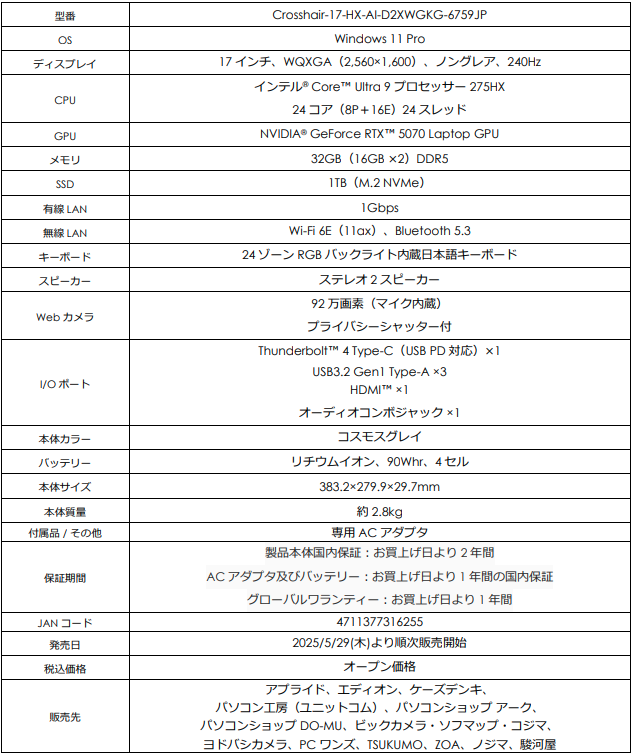 https://jp.msi.com/Laptop/Crosshair-17-HX-AI-D2XWX