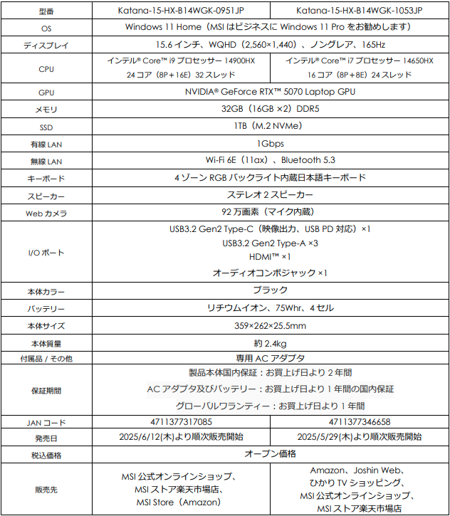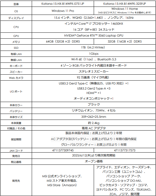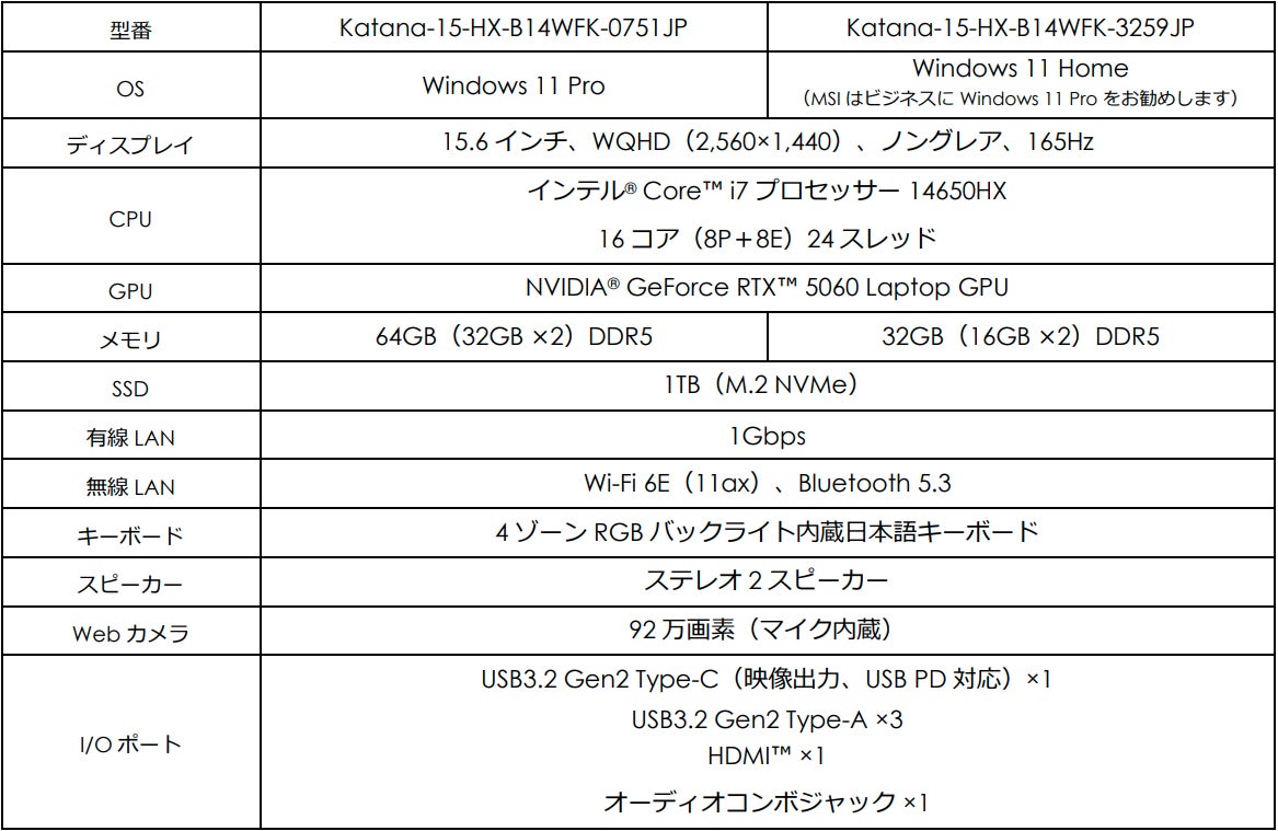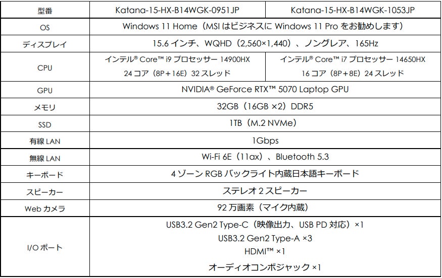 ・Katana 15 HX B14Wシリーズ製品ページ:https://jp.msi.com/Laptop/Katana-15-HX-B14WX