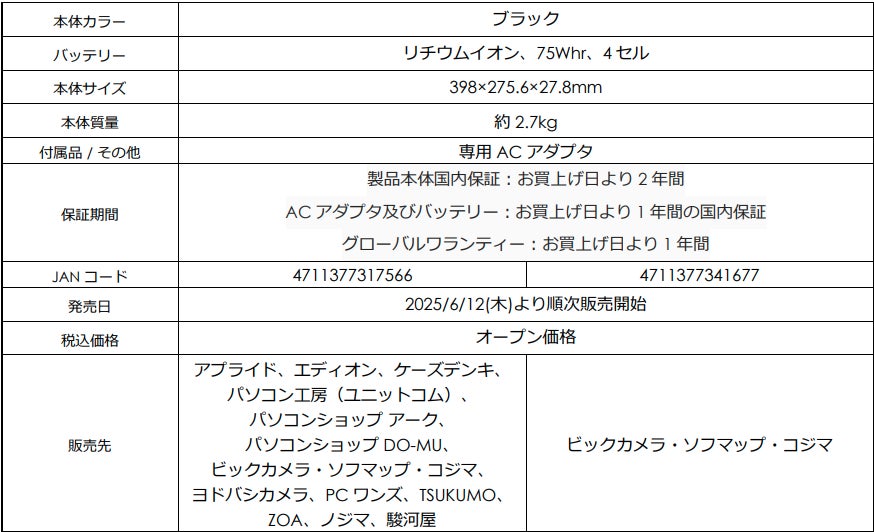 CPUに「インテル® Core™ プロセッサー(第14世代 HX シリーズ)」を採用し、ノートPCでもゲーミングデスクトップPCに匹敵するほどのCPU処理性能を実現。GPUに「NVIDIA® GeForce RTX™ 5070/5060 Laptop GPU」を採用し、最新ハンティングゲームを高フレームレートでプレイするために必要なゲーミング性能を提供します。さらに、一般的なパソコン用モニターと比較して2倍以上高速駆動の「滑らか表示ディスプレイ」、32~64GBの大容量メインメモリ、1TB高速タイプSSD、4ゾーンRGBバックライト内蔵ゲーミングキーボードなど、ゲーミングPCのトレンドとなる構成や機能を採用し、迷わず選べる・選んで安心のビギナーゲーマー向けモデルとなっています。