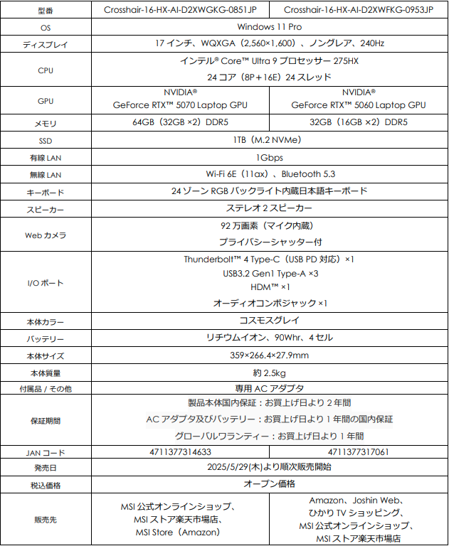 この度、エムエスアイコンピュータージャパン株式会社は、ゲーミングノートPC向け高性能GPUの最新モデル「GeForce RTX™ 5070/5060 Laptop GPU」を搭載したハイパワーゲーミングノートPC「Crosshair 17/16 HX AI D2XW」シリーズとハイスペックゲーミングノートPC「Katana 17/15 HX B14W」シリーズを2025年5月29日(木)より順次発売いたします。