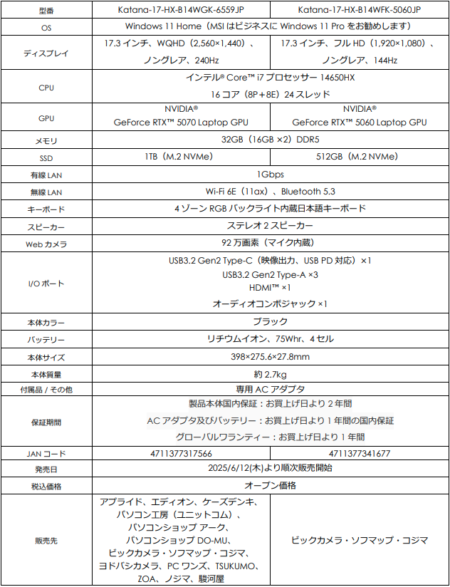 ・Katana 17 HX B14Wシリーズ製品ページ:https://jp.msi.com/Laptop/Katana-17-HX-B14WX