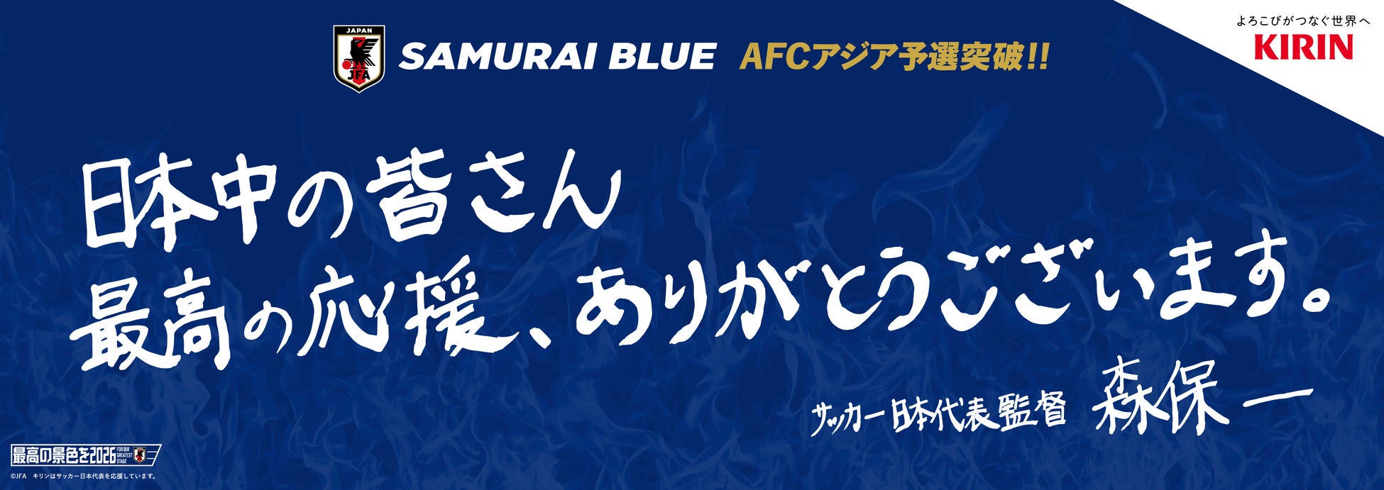 2026年に向けて、「SAMURAI BLUE」(サッカー日本代表)は「最高の景色」を目指し、歩み始めました。「SAMURAI BLUE」がさらなる飛躍をしていくために、重要な強化の場として「キリンチャレンジカップ2025」を、サッカーファミリーが楽しみに待つ全国4会場で2025年10月、11月に実施します。キリンは、1978年より45年を超え、サッカー日本代表を応援し続けてきました。これからも、日本中のサッカーファミリーとともに心を一つにして、「SAMURAI BLUE」の世界への挑戦を引き続き全力で応援していきます。
