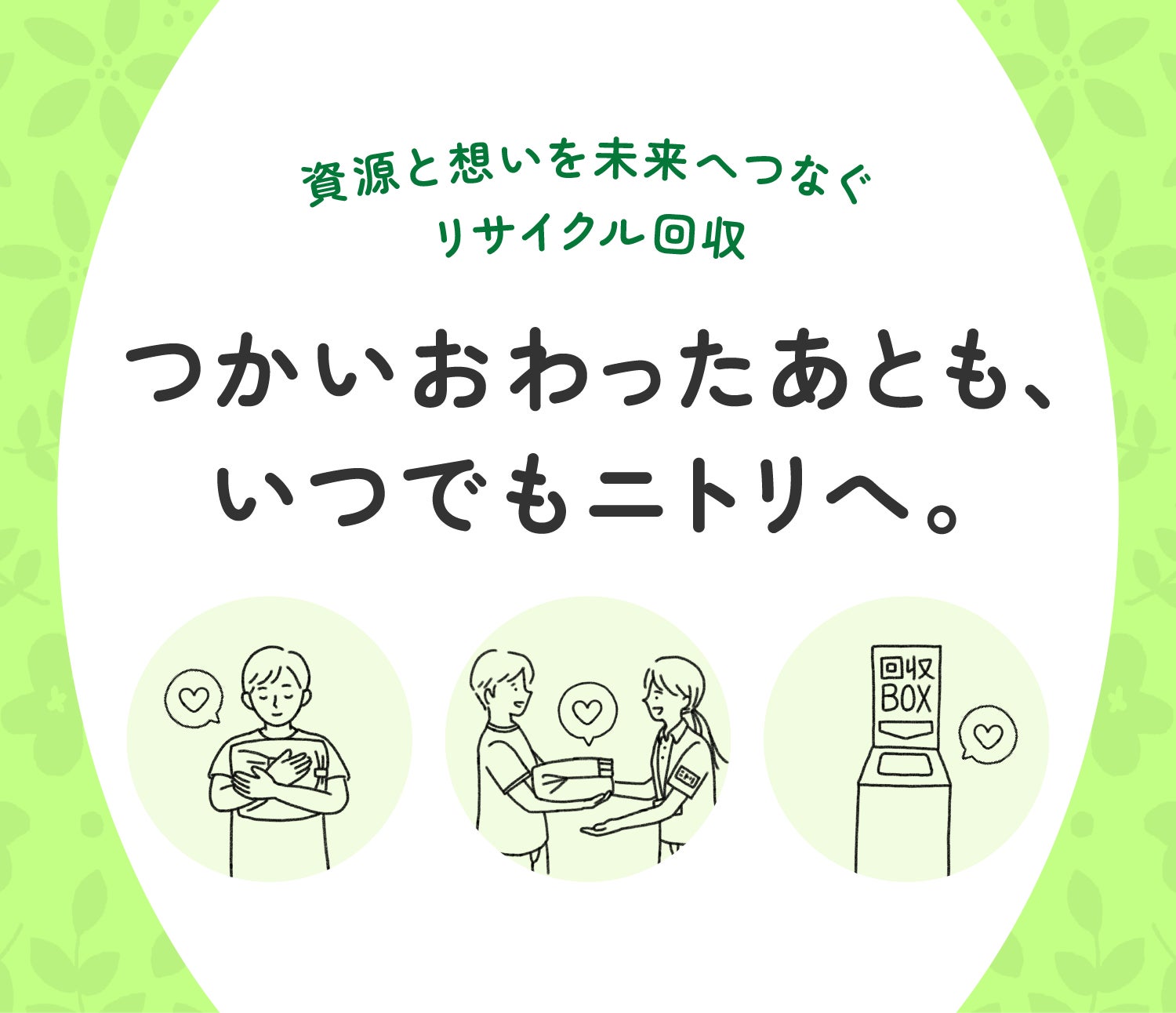 ニトリグループは、サーキュラービジネスの推進として、カーテン・羽毛布団・タオルのリサイクル回収を全店舗で実施している。販売元を問わず回収を受け付けることで、お客様の処分の悩みに寄り添い、限りある資源の有効活用と持続可能な社会の実現を目指している。
