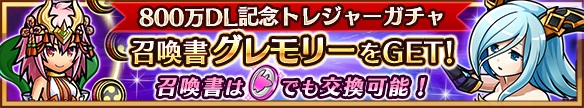 800万DL突破を記念して「800万DL記念トレジャーガチャ」を開催いたします。味方全体に吸血効果とビースト効果を付与するユニゾンスキルを持つ新モンスター「グレモリー」や新装備が登場。「グレモリー」は、ギルドメンバー全員で強力なボスに挑むリーグ討伐戦や超難関クエスト「静穏の海帝と巨龍の絆」など幅広く活躍します。また、トレジャーガチャや、宝箱の中身から獲得できるメダルを特定枚数集めることで、確実に「グレモリー」の召喚書を獲得することができます。