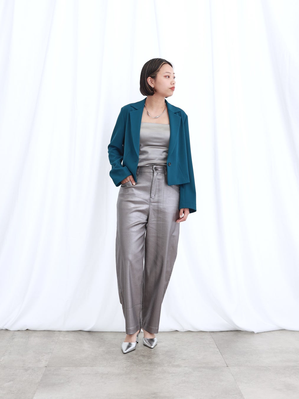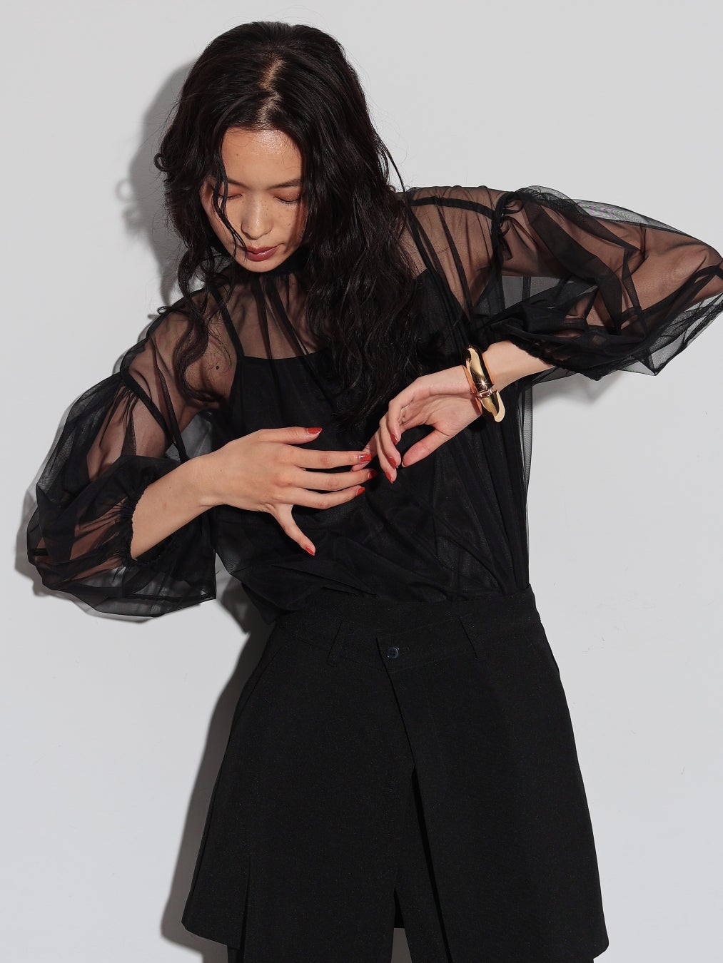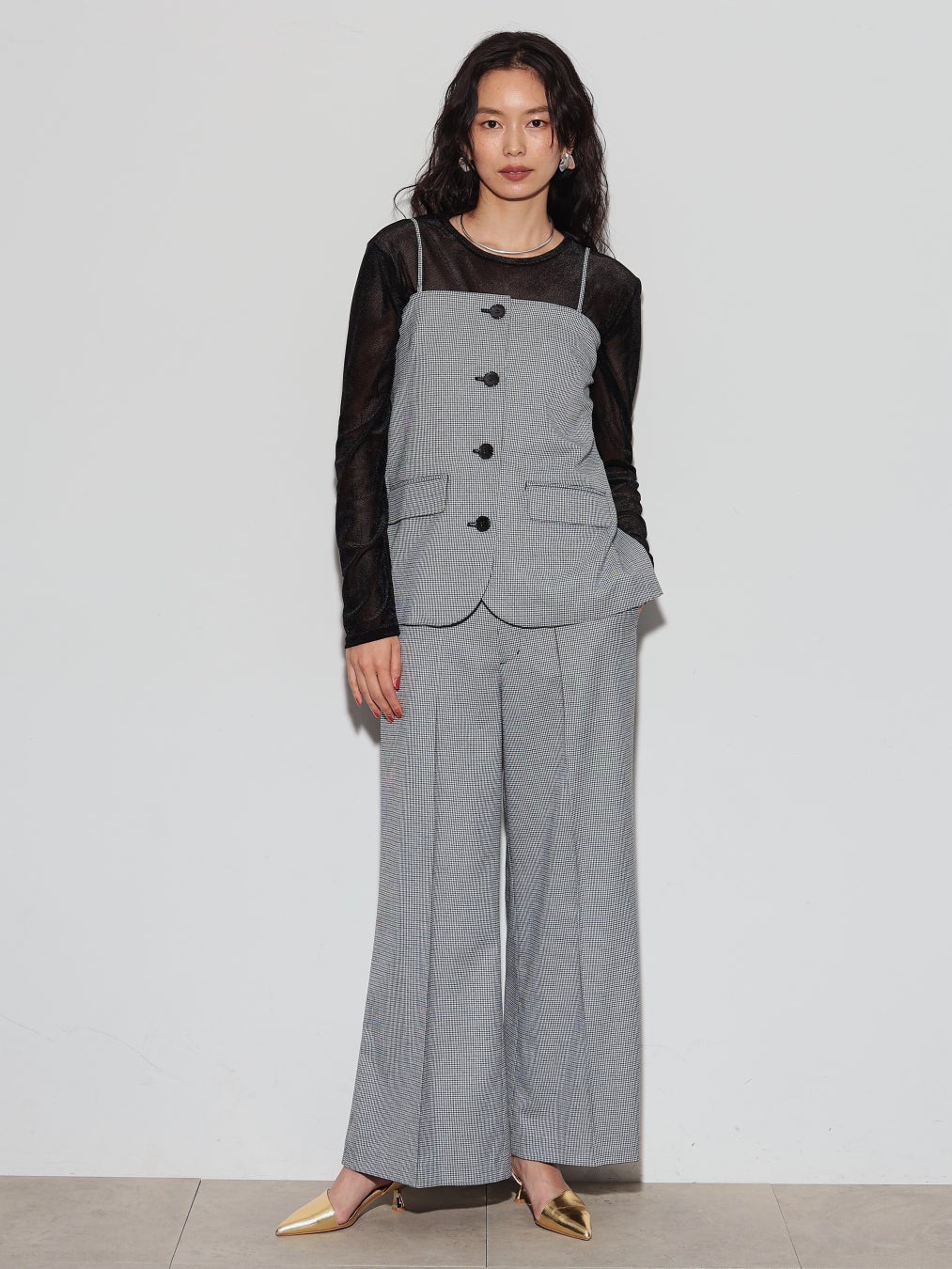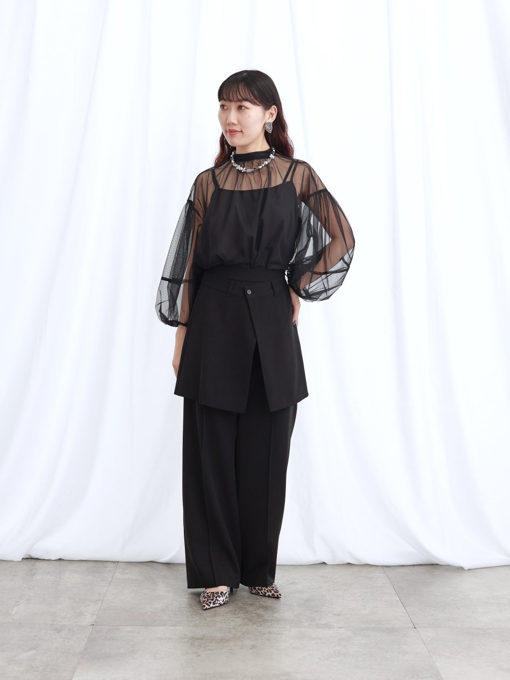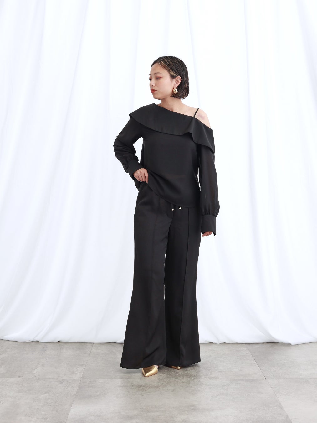 今回の秋の新作プレオーダーでは、展示会で注目度の高かったポンチョ風デザインのデニムジャケットとワイドデニムのセットアップやキャッチ―な箔デザインのボトムス、キャミソールがセットになったシアーブラウスなど、秋の立ち上がりを盛り上げるGALLESTらしいモードカジュアルアイテムを展開。