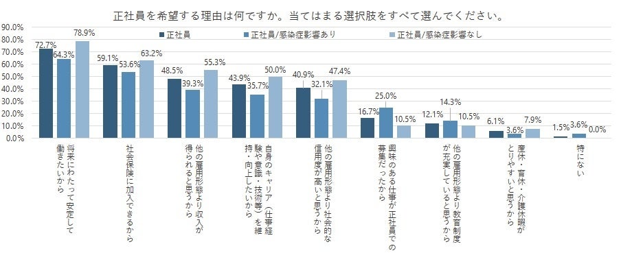 一方、「感染症影響なし」の人は「感染症影響あり」の人よりも「他の雇用形態より収入が得られると思うから」で16.0pt、「他の雇用形態より社会的な信用度が高いと思うから」で15.3pt、「将来にわたって安定して働きたいから」で14.6pt高かった。正社員希望全体でみて上位項目5つは、「感染症影響なし」の人々からの支持が高くなっている。