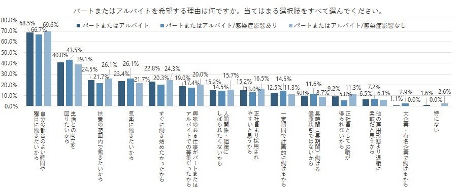 パートまたはアルバイトを希望する人に、なぜその雇用形態を希望するのかをきいた(複数回答)。最も多かったのは「自分の都合の良い時間や曜日に働きたいから」で68.5%、次いで「生活との両立を図りたいから」が40.8%、「扶養の範囲内で働きたいから」が24.5%となった。
