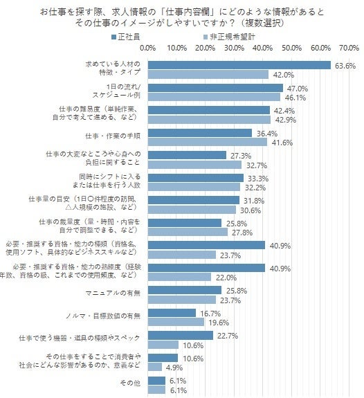 今回の調査では、「求人情報の仕事内容欄に記載されていると、仕事内容が想像しやすい事項」について聞いています。正社員希望者と非正規雇用希望者では傾向が異なり、正社員希望者では「求める人材の特徴・タイプ」が最多、非正規雇用希望者では「1日の流れ/スケジュール」が最多となりました。欲しい人材によって記載事項も工夫することが重要であることがわかります。人材募集の原稿作成に参考になれば幸いです。