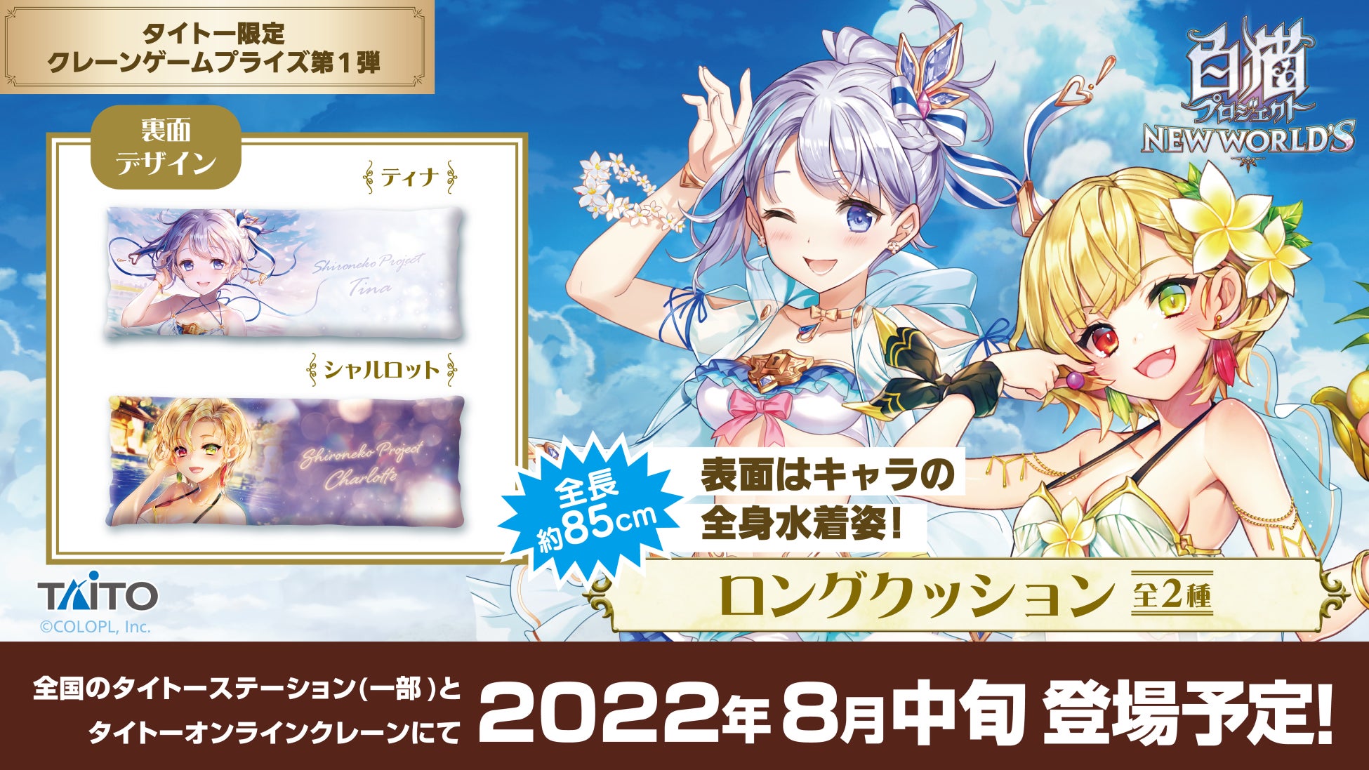 8月中旬にはティナ、シャルロットの2人を描いた長さ85cmのロングクッションが登場いたします。水着のイラストを用いた、大変かわいいクッションとなっております。