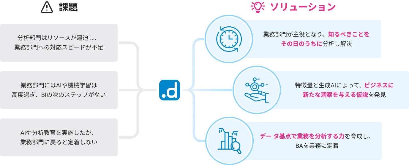 dotData社のビジネスアナリティクス人材育成サービスは、「データを分析するスキル」よりも「データをもとにビジネスを分析する能力」を育成し、データドリブンな企業文化の確立を支援します。