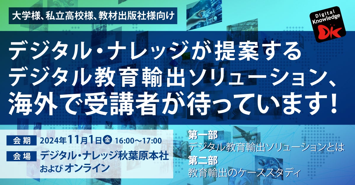 「日本型教育の海外展開」デジタル・ナレッジが提案するデジタル教育輸出ソリューション、海外で受講者が待っています《11/1(金)秋葉原会場&オンライン開催》大学様・私立高校様・教材出版社様向け
