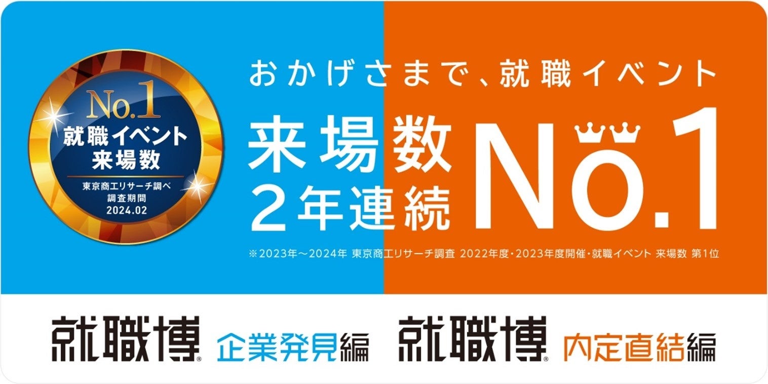 株式会社学情(本社:東京都千代田区)が運営する合同企業セミナー「就職博」は、東京商工リサーチの調査で「就職イベント来場数No.1」を獲得しました。2023年に続き、2年連続でのNo.1獲得となります。多くの学生・求職者、企業、学校関係者の皆様から支持・支援いただいているおかげで、来場数No.1を実現することができたと考えています。様々なステークホルダーから支持されている特性を活かして、学生・求職者と企業の価値あるマッチングを実現してまいります。