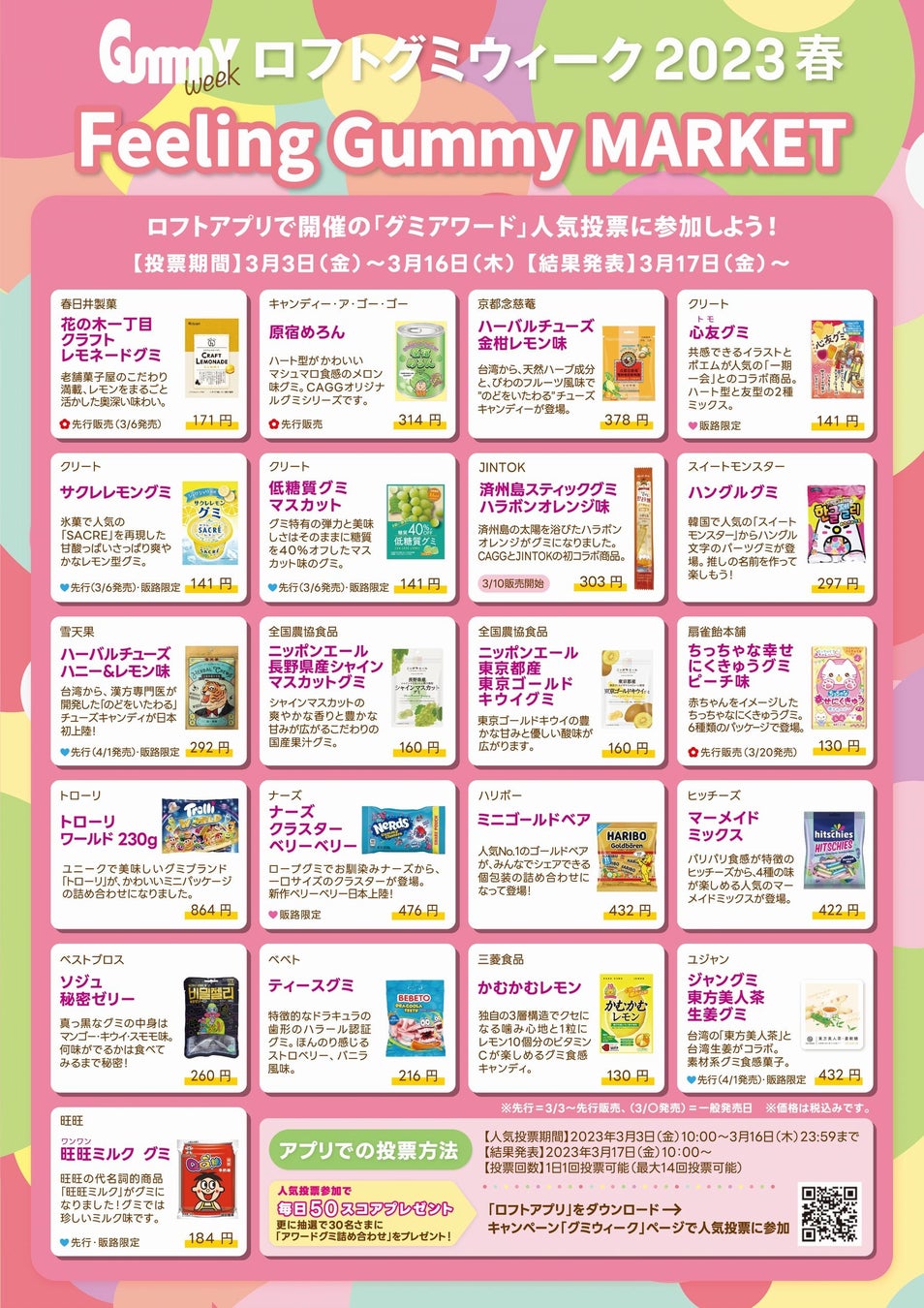 渋谷ロフトは3月3日(金)~3月19日(日)の17日間、お菓子販売メーカー参加型イベント「グミウィーク2023春」を開催いたします。「グミウィーク」とは、2017年から『9月3日の「グミの日」』 を記念してロフトが企画・運営するイベント。グミの販売と様々な企画を通してグミの魅力を情報発信し、昨年からは春と秋の年2回開催しています。春のイベントでは、誰かを想ってプレゼントしたくなるグミ=「フィーリンググミ」をテーマに、9月3日を逆さにした3月9日「サン(3)キュー(9)」と掛け合わせ、グミをプレゼントする日として提案。参加メーカー18社から「プレゼントにオススメのグミ」がノミネートされ、ロフトアプリのオンライン人気投票で「グミアワード」を決定します。