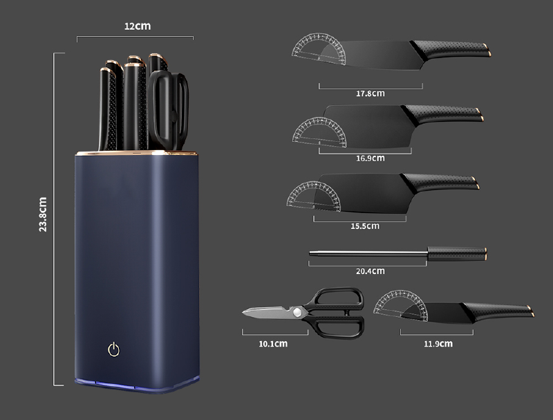 同梱物:UVC除菌ボックス、牛刀包丁、菜切包丁、中華包丁、果物ナイフ、キッチンバサミ、研ぎ棒、USB充電ケーブル