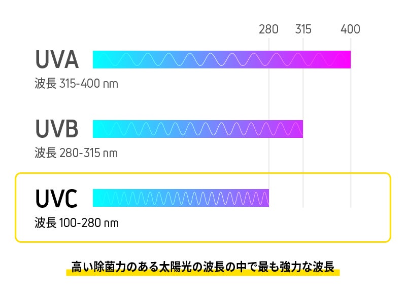 UVCとは、太陽光の波長の中で最も強力な波長で、高い除菌力を誇ります。