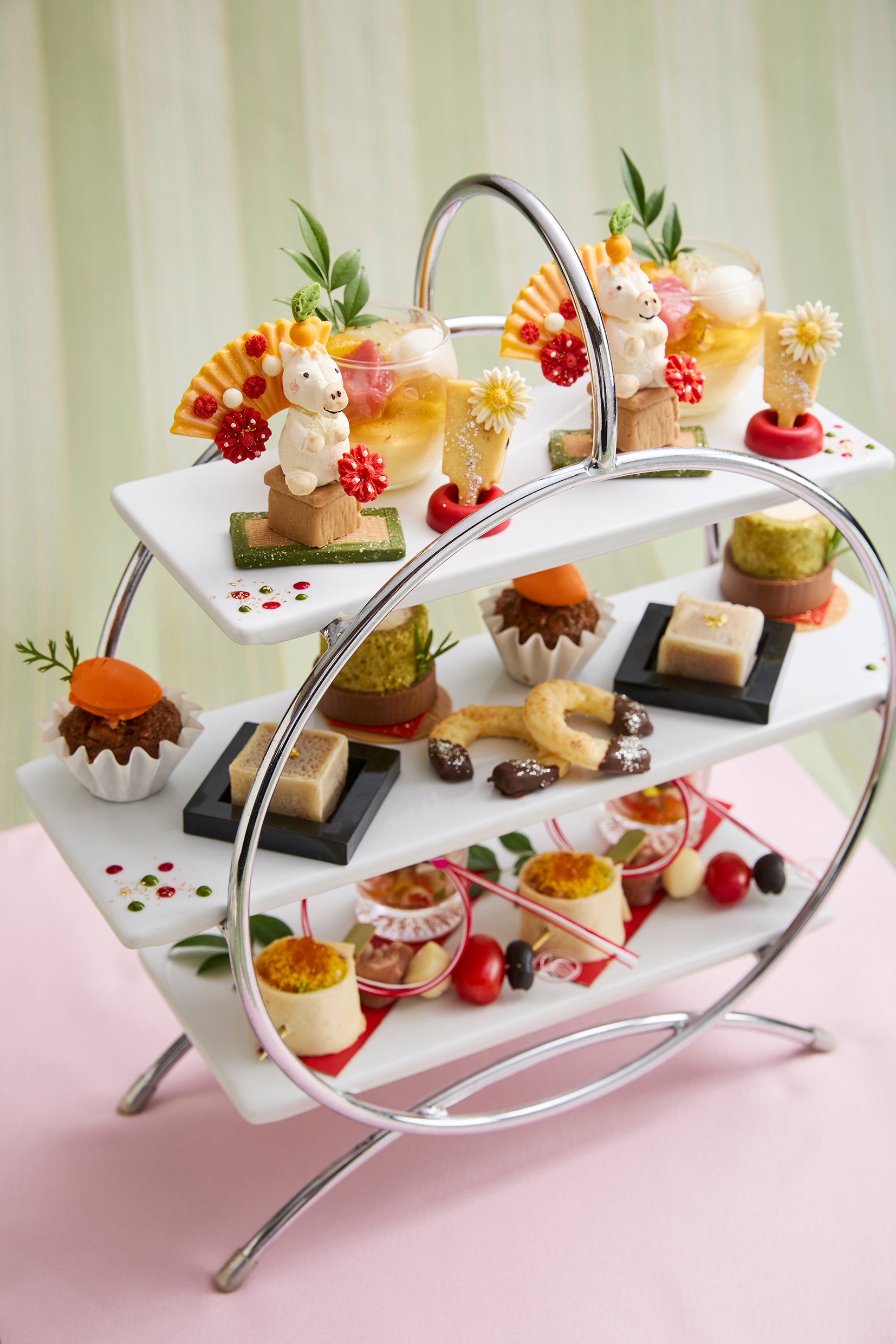 セイボリーには、いくらなど7種の素材を入れ、門松に見立てたスモークサーモンのトルティーヤロールや、紅白でめでたさを表したカプレーゼ、ペッパーのアクセントが心地よい蛸の洋風なますがラインナップ。和と洋が調和したおめでたさあふれる「新春アフタヌーンティー」で、美味しいお正月をお迎えください。