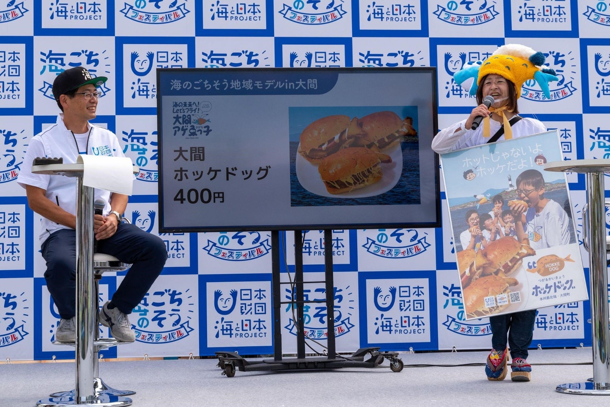 続いてのステージプログラム「海のごちそうキッチン&マルシェPRタイム」には、共催である日本財団の海野常務理事がステージに登壇し、出店者たちと、メニュー・商品開発の裏側にある海の課題やストーリーについて語り合いました。マグロで有名な青森・大間からは「海と大間の未来づくり実行委員会」の島さんが登壇し、マグロだけでなくおいしい白身の魚がとれることをアピール。魚嫌いの子どもにもおいしく白身魚に親しんでもらえるようにと考案したカレー風味の「大間ホッケドッグ」を紹介しました。試食した海野常務理事は「おいしかった。大間の子どもたちを巻き込みながら、プロジェクトを推進させていってほしい」と激励しました。