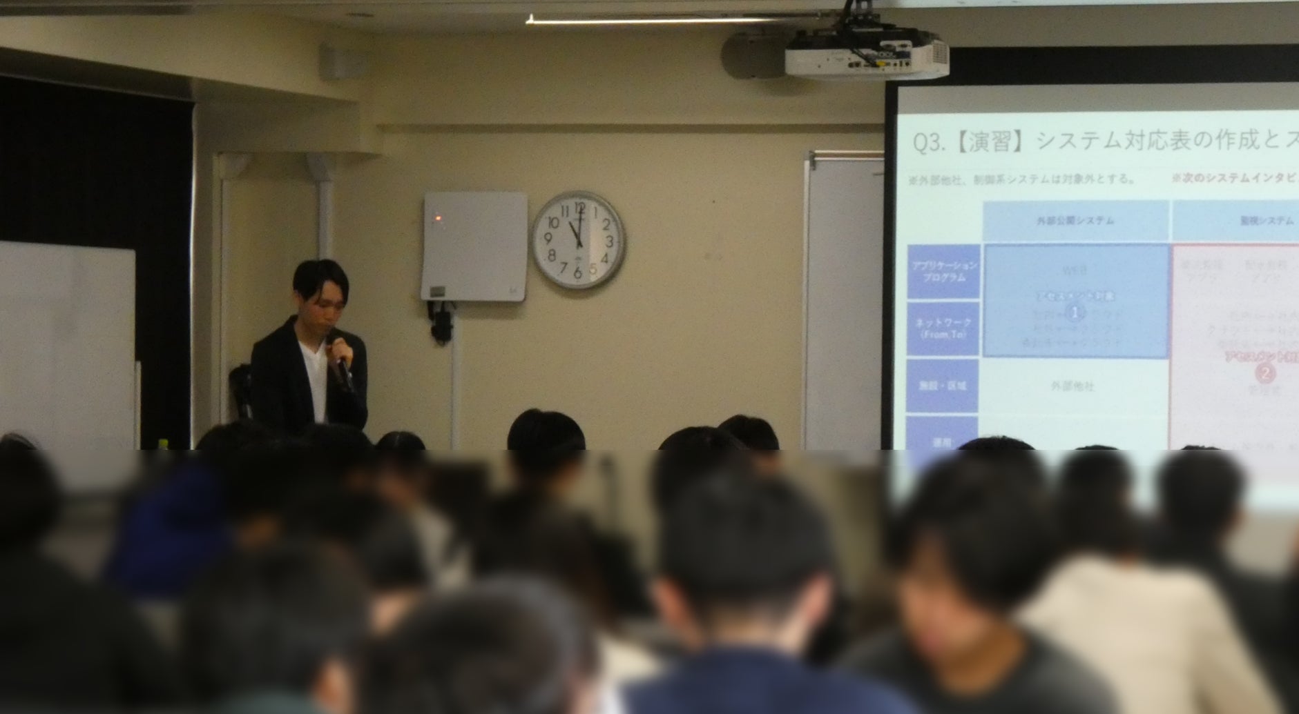 本講義は、デジタル社会に不可欠なサイバーセキュリティの重要性に着目し、セキュリティ対策を考える上で必要となるリスクアセスメント手法について、基本用語の学習から事例を用いたグループワークによる実践演習までを行いました。今年度で二年目を迎えたことで、昨年度の実施内容を踏まえて教材や演習方法をさらに改善し、グループワークにおける役割分担や発表形式を強化するなど、より実践的な学びを提供しました。これにより、学生が主体的に取り組める環境を整え、リスクアセスメントの知識習得だけでなく、社会人として求められるコミュニケーション能力や課題解決能力の向上を図りました。学生からは「インタビューなどの演習を通じて企業がどのようにリスクを発見し、対策しているのかを理解できた」「他の人の意見を聞くことで、新たな視点や考え方に気づいた」などの声が寄せられています。また、昨年度受講した学生からも「夏季インターンでこの内容がそのまま役立った」など、実際の活動の中でも役立っているという声を頂きました。