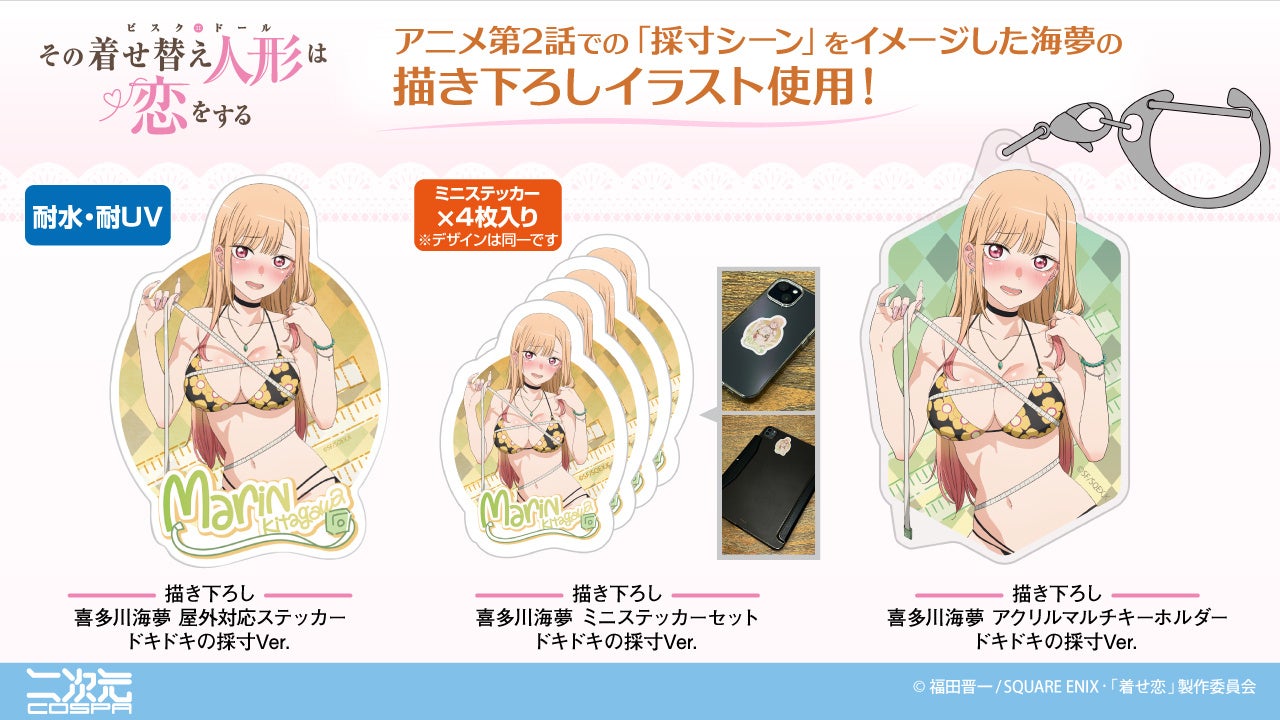 TVアニメ「その着せ替え人形は恋をする」より、「喜多川海夢」の描き下ろしイラストを使用した水着姿の「ステッカー」や「キーホルダー」が二次元コスパから登場。
