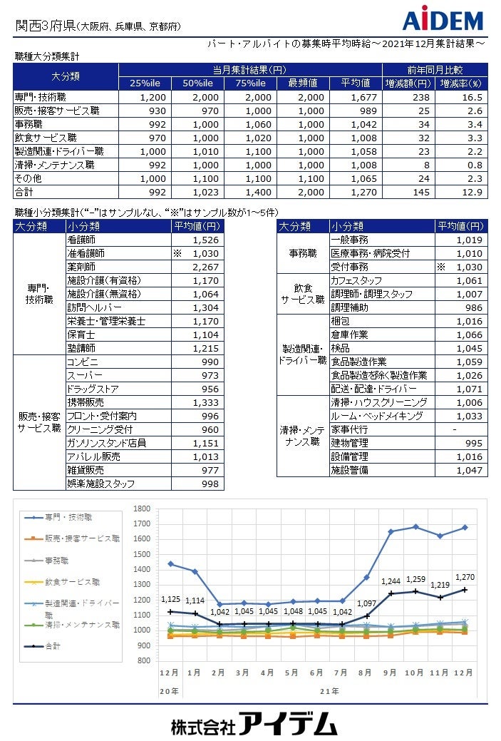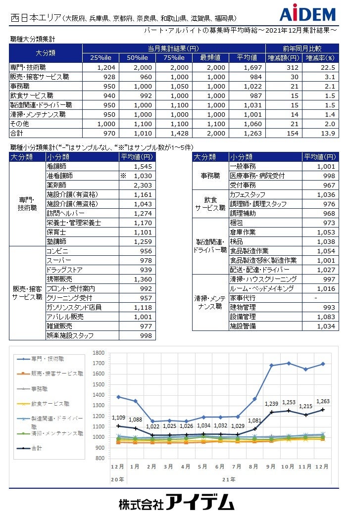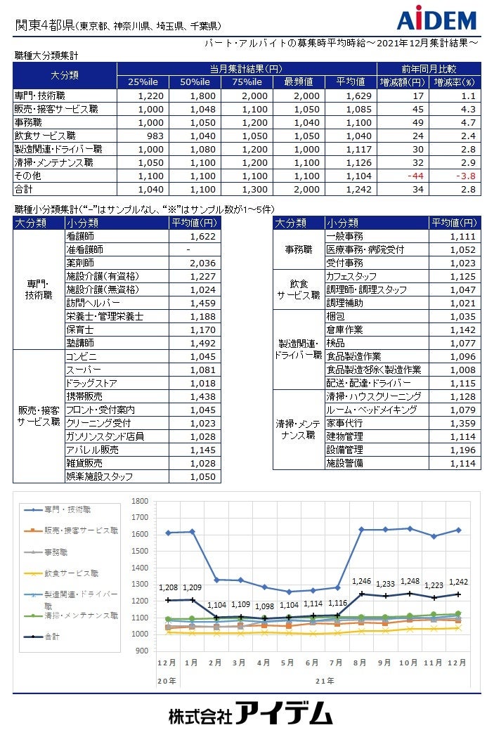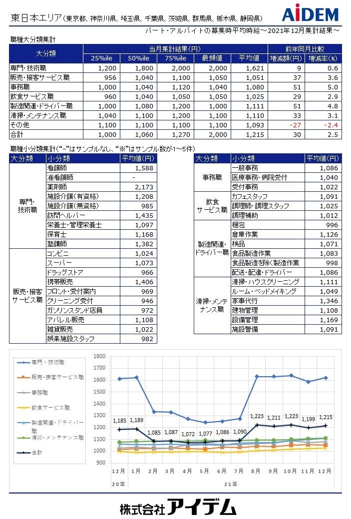 総合人材情報サービスの株式会社アイデム(本社:東京都新宿区 代表取締役社長:椛山 亮)は、求人メディア『イーアイデム』や採用ホームページ構築サービス『Jobギア採促』を利用して公表された求人情報から、2021年12月のパート・アルバイト募集時平均時給を集計いたしました。