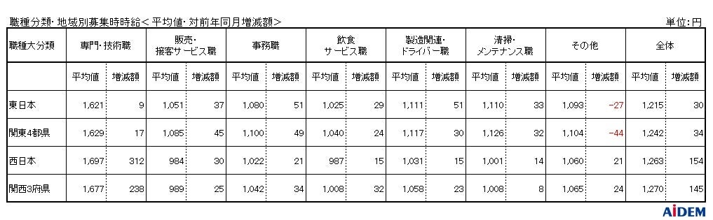 - 東日本エリア全体の平均時給は、前年同月比30円増の1,215円