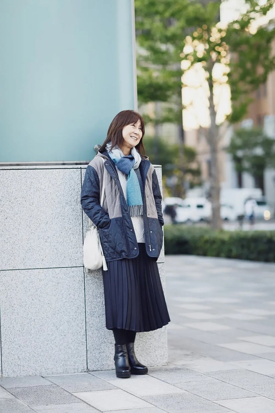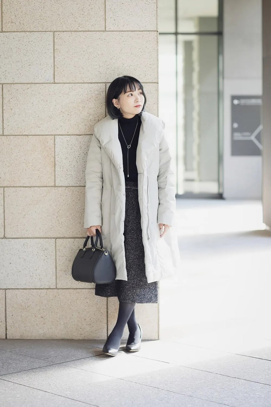 身体をあたたかく包み込んでくれるロング丈のダウンコート。ショールカラーは、首回りを防寒しつつ上品な印象に見せてくれます。どうしても膨張して見えるロングダウンは、コートの開きで縦のラインを意識するのが◎。インナー上下をブラックコーデにすることで一層引き締まり、嬉しいスタイルアップ効果も。パールが揺れるラリエットネックレスで目線を引きつけて。