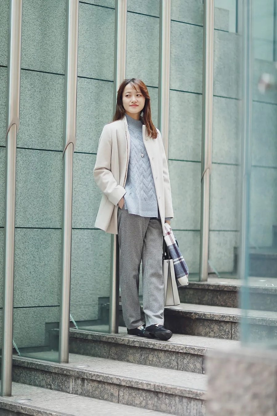 スタンドカラーに同系色の比翼ボタンを配したすっきりとした面持ちのコートスタイル。ニットやボトム、マフラーなど、柄アイテムが増える冬コーデに、上品な柔らかさをプラスしてくれるグレージュです。パンツ合わせでもヒップをさり気なくカバーしてくれる、絶妙な丈感が嬉しいポイント。冬のニットの上にもさらっと羽織って出かけられる軽い着心地で、電車や車移動の際にもおすすめ。