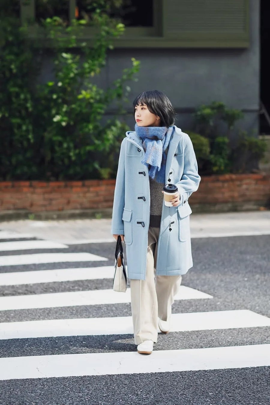 トラッドな冬の着こなしに欠かせないのがダッフルコート。本格的なディテールはそのままに、野暮ったくなりがちなこの季節のコーディネートを明るく彩る、サックスをご用意しました。表情豊かなウールへリンボーン生地がシンプルなコーディネートにマッチします。ニット&パンツは淡いラテカラーで統一。ローファーにはホワイトを選ぶことで、ワイドパンツでも軽快な印象に。コートとニットのカラーに合うモヘヤマフラーを巻いて休日を愉しんで。