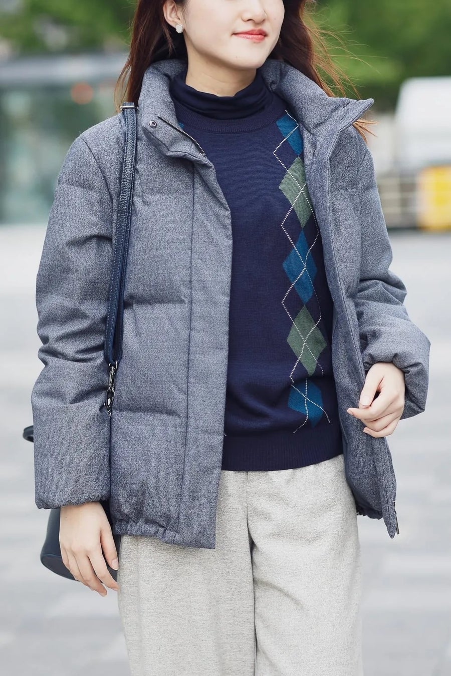 カジュアルになりすぎない上品さが魅力のショートダウンは、何色もの糸が混ざり合ったウール100%のメランジクロスを使用。深みのある面持ちで、コーディネートに表情をつけてくれます。コンパクトな着丈のため、ワイドシルエットのボトムともバランス良くスタイリングが可能。上半身はネイビー・下半身は淡色でまとめることで、メリハリの効いたスタイリングに仕上がり、抜け感もアップ。アーガイルニットの下には同色のカットソーを合わせて、おしゃれに防寒対策を。