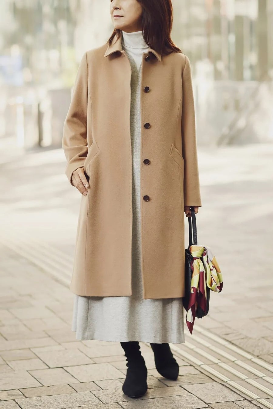 ベーシックでオンオフコーディネートしやすいステンカラーコート。ほのかな光沢感が美しいファインラムズウールを100%使用した滑らかな生地が魅力。着丈長めのジャンパースカートとのスタイリングで、あたたかみがありながら上品で洗練された印象に。冬はインナーにタートルネックニットを合わせて、シンプルにあたたかく。バッグにスカーフを巻いて、カラーと光沢をプラスするのもさり気ないポイントです。