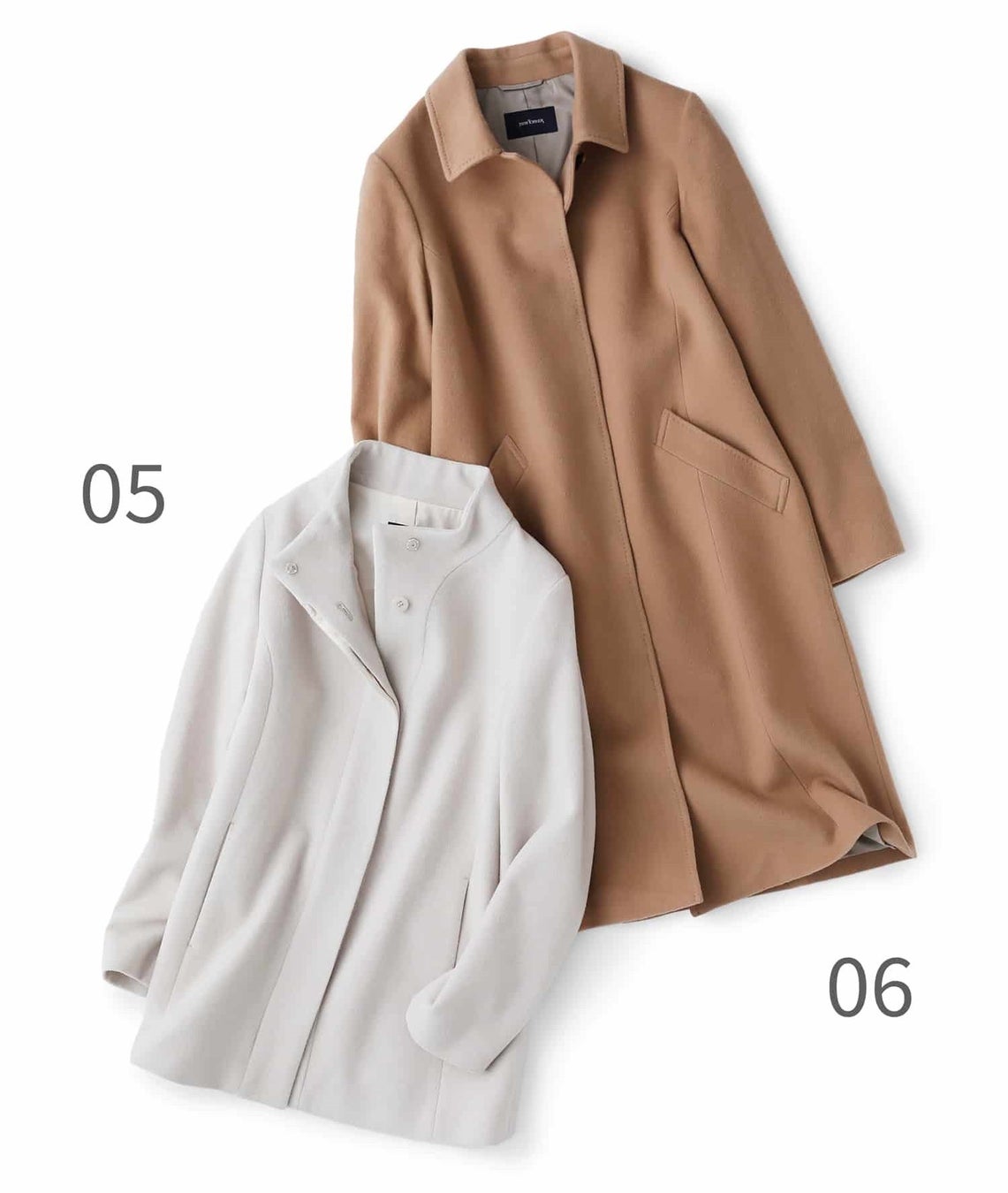 06.ウールの温かみと滑らかなタッチが魅力のステンカラーコート。汎用性の高いベーシックなデザインで、トレンドに左右されずオンオフどちらのスタイルにもマッチするアイテムです。カラーはシックに決まるキャメル、ブラックの2色展開。