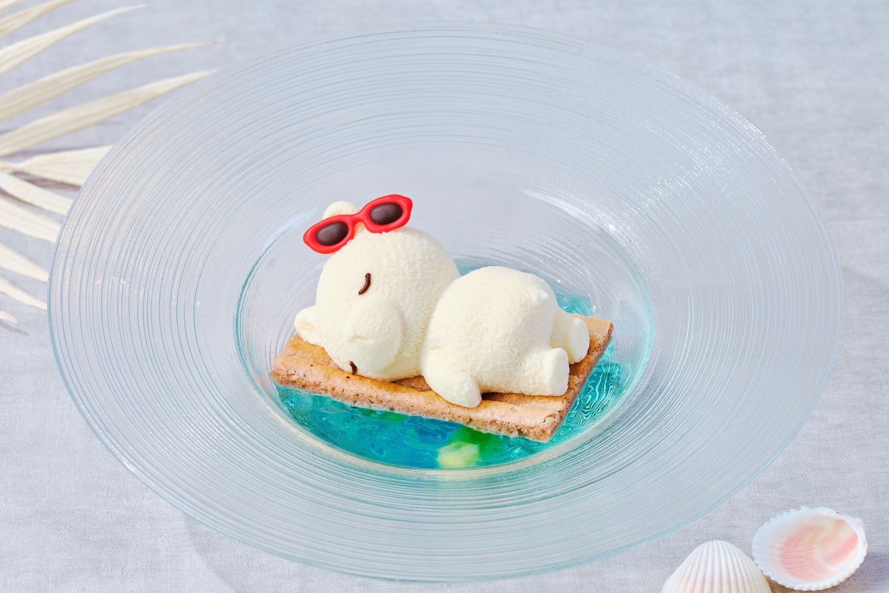 また、オプションとして楽しめる、赤いサングラスがチャームポイントの「ひんやり夢心地くまさんのムース」は、うとうと眠っている様子がとても可愛らしい、心地よく夢を見ながらプカプカと海に浮かんでいる様子をイメージしたスイーツです。