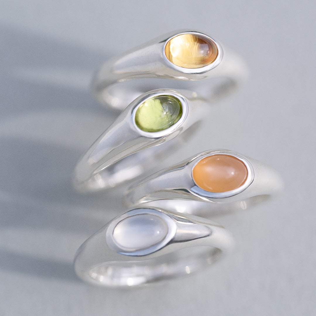 艶やかでボリュームのあるリングアームにジェリービーンズのようなカボションカットのカラーストーンを合わせたピンキーリング。小指に存在感のあるリングを持ってくると一気におしゃれ感を演出できます。