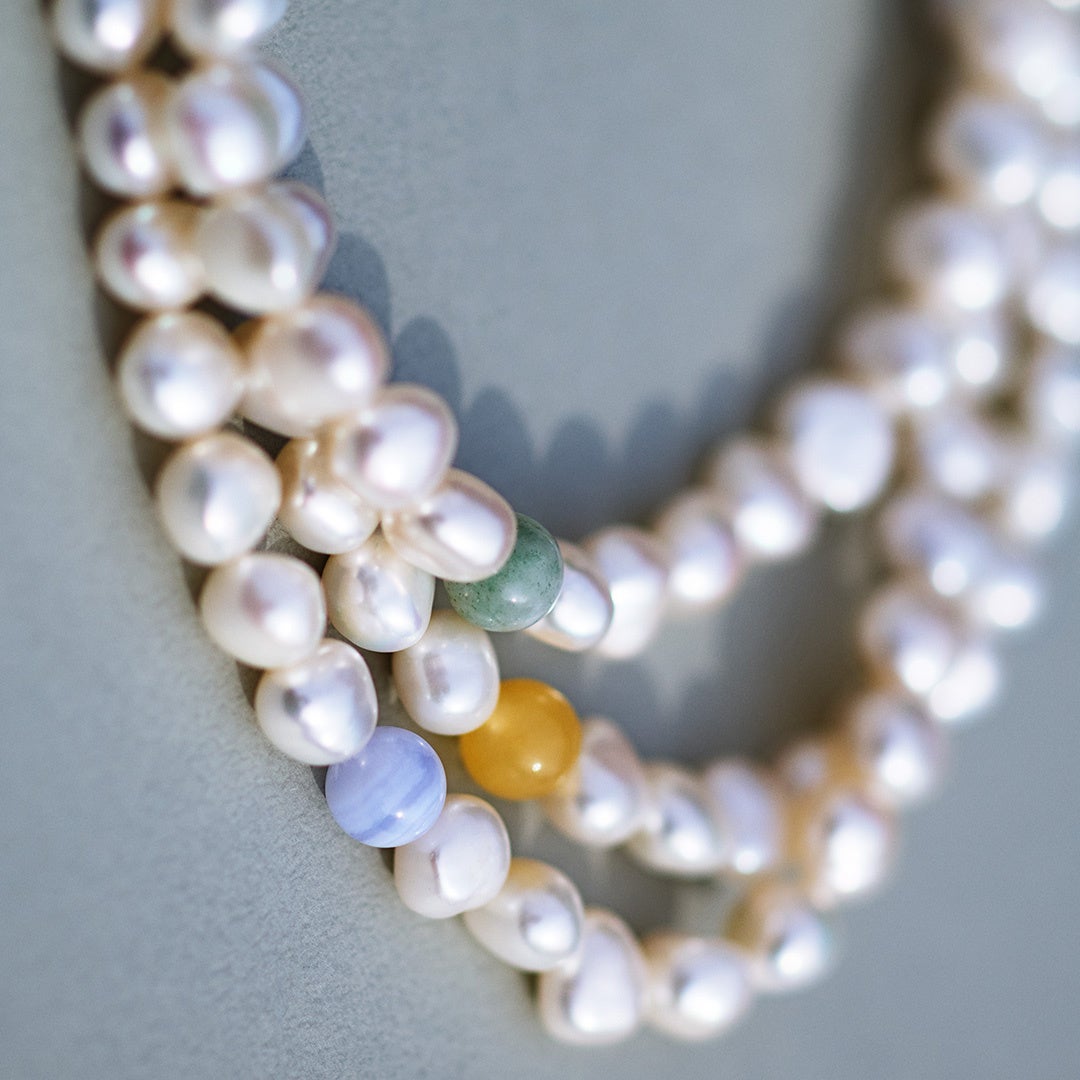 大粒で不揃いな淡水パールに1粒のカラーを添えてカジュアルに合わせたいネックレス。チョーカーのように短めに着けて、ネックレスとレイヤードするスタイリングがおすすめ。