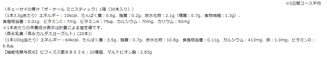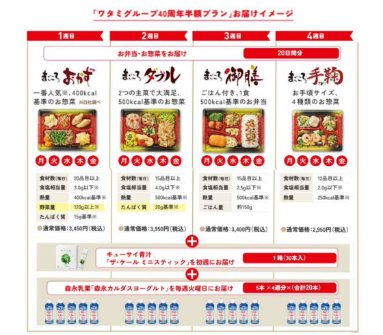 ・対象商品:1週目「まごころおかず」、2週目「まごころダブル」、3週目「まごころ御膳」、4週目「まごころ手鞠」に、キューサイの青汁「ザ・ケールミニスティック」1箱(30本入り)と森永乳業の「森永カルダスヨーグルト」20本のセット