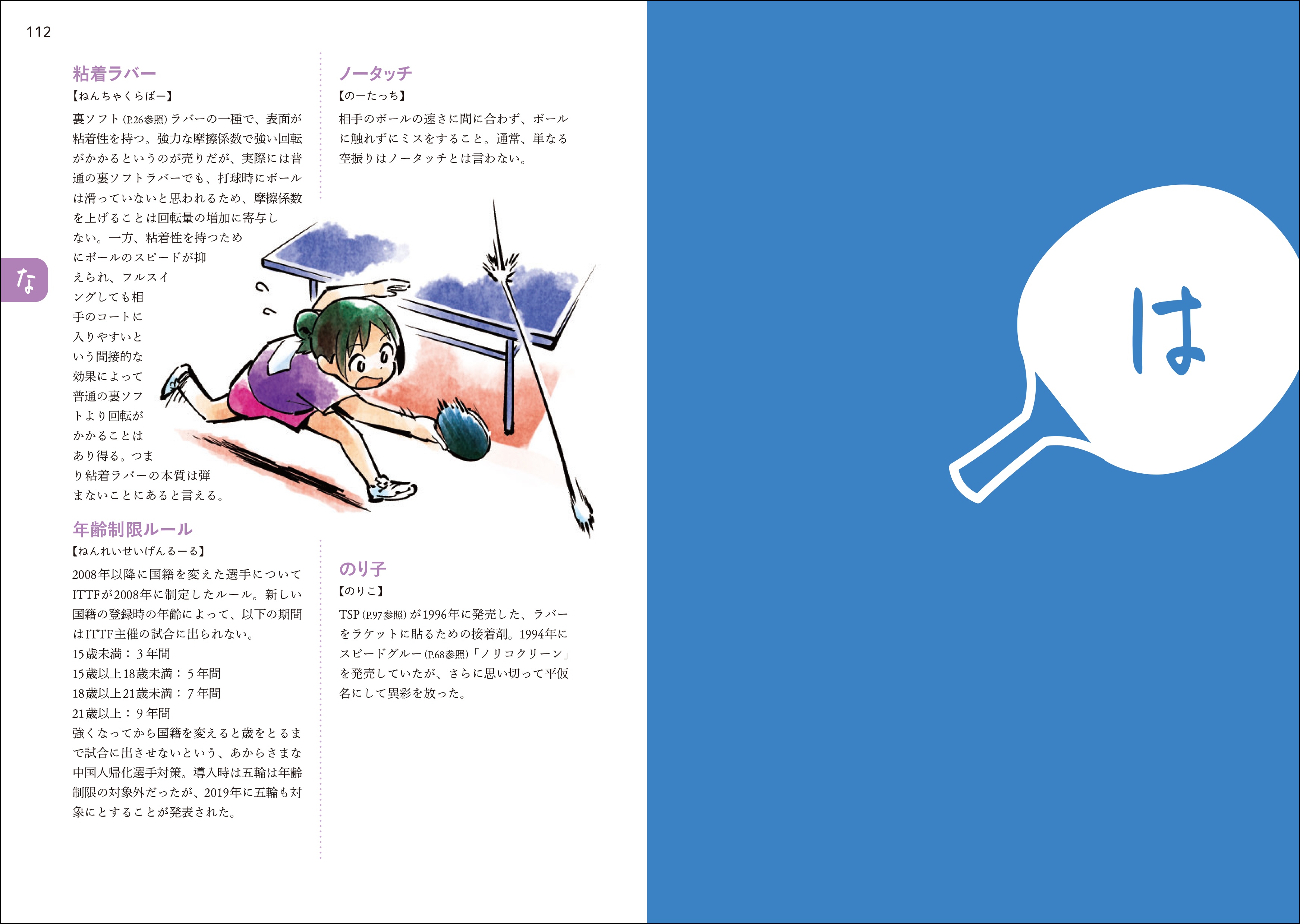 本書では、そんな誰でも気軽に楽しめる卓球について、現役選手はもちろん、伝説の選手や今では禁止になっているワザ、ディープすぎる用具への偏愛、あの独特の掛け声の変遷など、豊富なイラストとともに50音順で紹介しています。