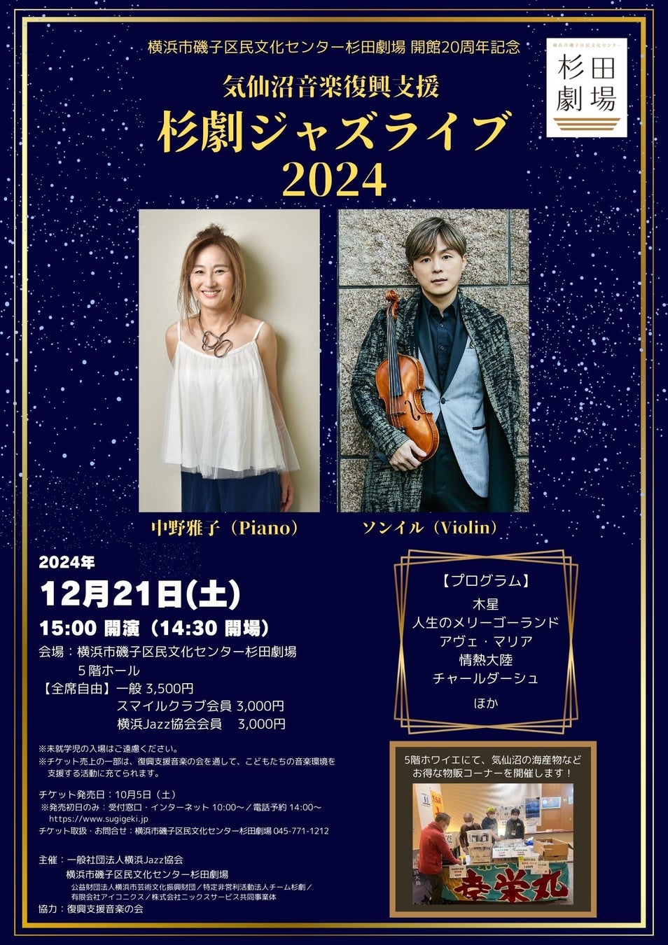 12月21日(土)は恒例の「気仙沼音楽復興支援 杉劇ジャズライブ2024」が開催、磯子区出身のジャズピアニスト中野雅子さんと、日本を拠点に国内外で活躍するヴァイオリニストのソンイルさんによるセッションが師走の冬に華を添えます。プログラムは映画音楽など、ポピュラーな曲を本格的なジャズスタイルで演奏するもので、初心者から愛好家まで幅広くお楽しみいただけます。