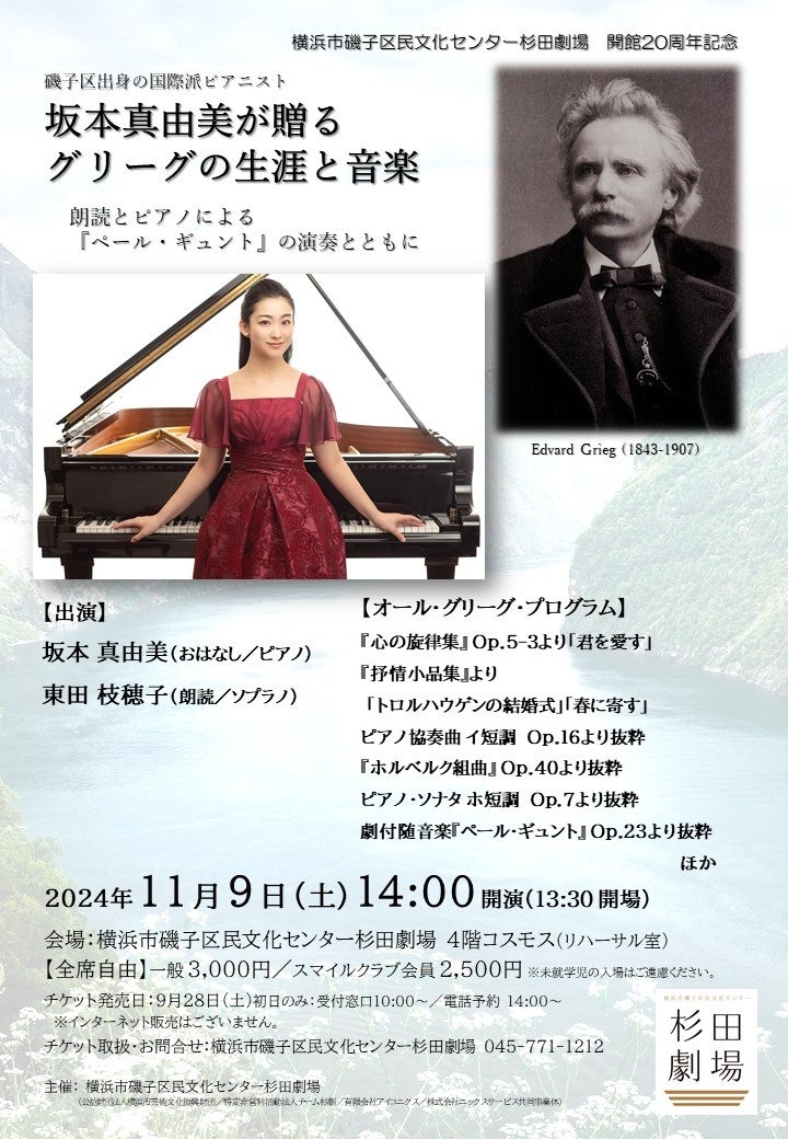11月は9日(土)に「坂本真由美が贈る グリーグの生涯と音楽」を開催、リハーサル室という小規模スペースで演奏家と間近にふれあえる環境で、プロジェクター映像とピアノ演奏、朗読による名曲『ペール・ギュント』をメインに、グリーグ国際ピアノコンクール優勝など華々しい経歴を持つ磯子区出身のピアニスト、坂本真由美さんがおはなしと演奏で贅沢なひとときを提供いたします。