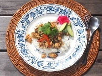 徳島県の銘柄鶏“阿波尾鶏”の胸挽肉と、タイ産ホーリーバジルを一緒に炒めた、ピリ辛がクセになるおいしさ。