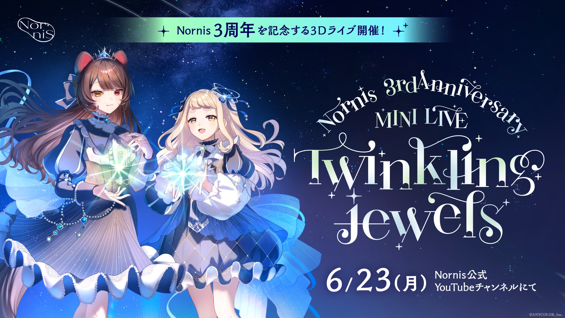 2025年6月23日(月)21:00より、3Dミニライブ「Nornis 3rd Anniversary MINI LIVE『Twinkling jewels』」をNornis公式YouTubeチャンネルにて無料生配信いたします。