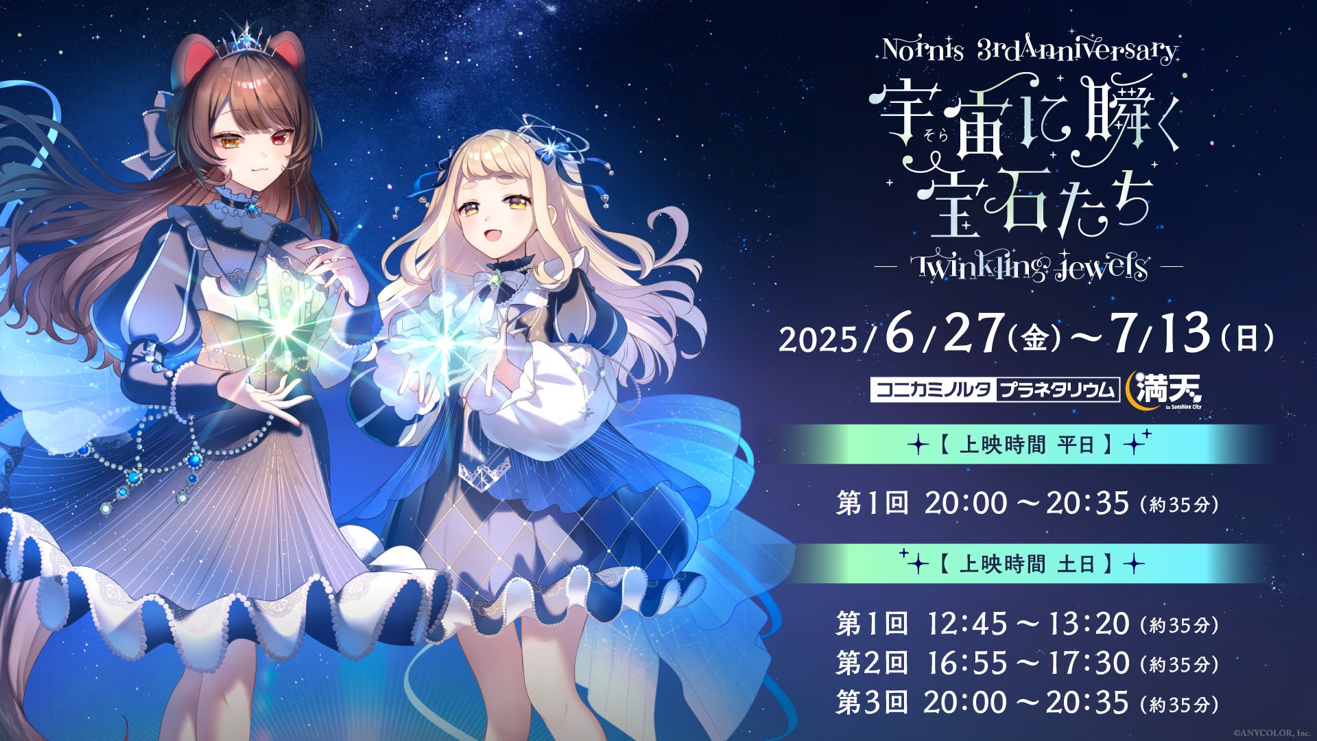 Nornisの歌、戌亥とこと町田ちまのナレーションでおくるオリジナルプログラム「Nornis 3rd Anniversary『宇宙(そら)に瞬く宝石たち - Twinkling jewels -』」を上映いたします。