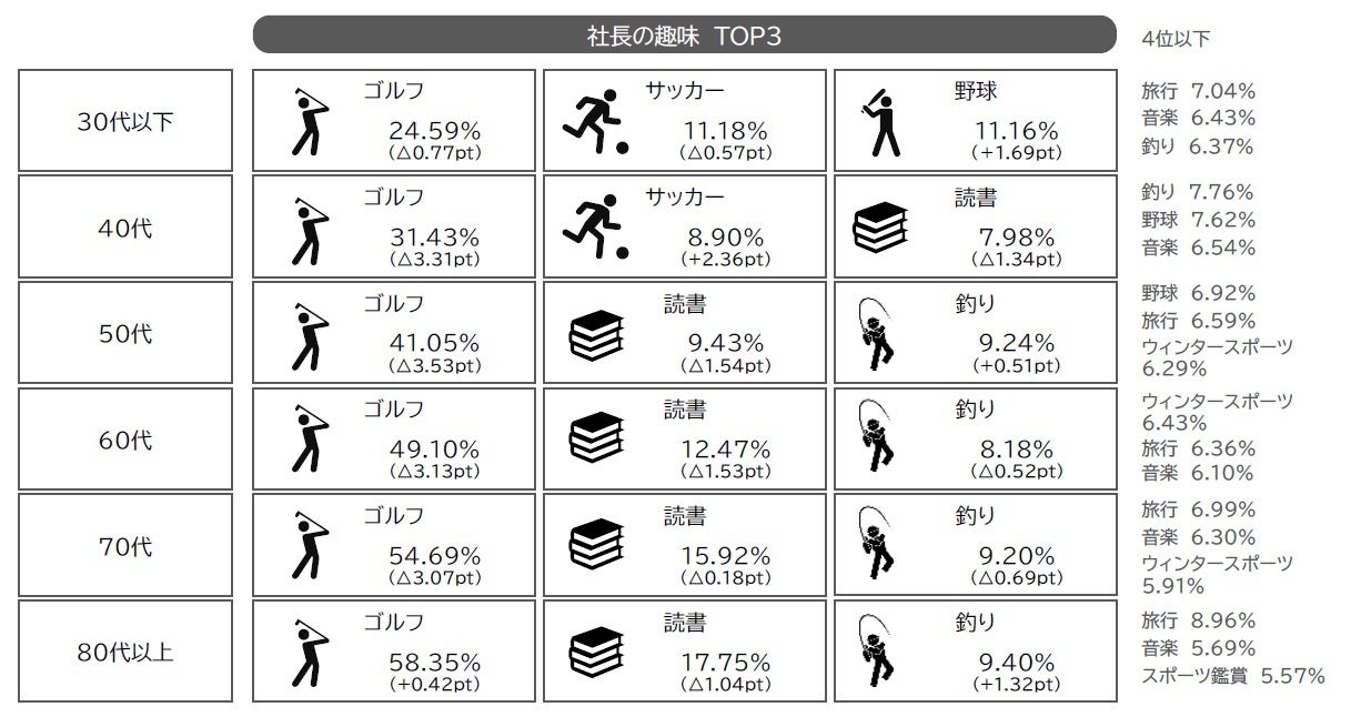 他方、50代以上ではゴルフに次いで「読書」「釣り」が多く、特に「ゴルフ」「読書」は年齢が高くなるほど趣味としての割合が上昇した。特徴的な趣味としては他に、50代~70代の社長ではスキー・スノーボードなど「ウィンタースポーツ」の割合が高く、第4~6位にランクインした。映画『私をスキーに連れてって』をはじめ、1970~80年代にかけて起きた「スキーブーム」の影響を多く受けた年代で、現在でも趣味として愛好する社長が多いとみられる。