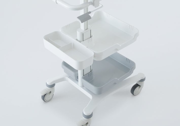 大容量かつ開口部が広く、取り出しやすい大型のトレーを備えています。ミニトレーを追加することで、清潔・準清潔・不潔物を分けて収納することができ、取り外しも簡単に行えます。不潔物を入れる下段のトレーは、ほかのトレーと区別するため異なる色を採用しました。(※ミニトレーは大容量タイプのみ標準装備。オプションでも購入可能。)