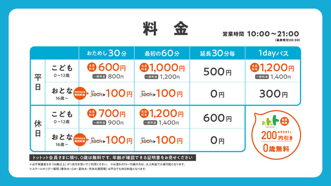 ・上記料金は子育て応援アプリ「トットット」に会員登録された方の会員価格です。入場当日にご登録いただいた場合も、当日から会員料金が適応されます。