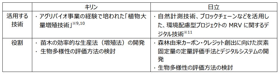 キリンの保有する「植物大量増殖技術」と、日立の保有する「自然計測技術とMRVに関連するデジタル技術」を融合させることで、質の高い森林由来のカーボン・クレジットの創出と、生物多様性の保全をめざし、2025年3月に共同研究契約を締結しました。キリンは「植物大量増殖技術」で従来の接ぎ木、挿し木技術よりも短期間で効率的に生産できる苗木生産方法を確立します。日立は「自然計測技術とMRVに関連するデジタル技術」を活用し、炭素固定量の定量評価手法の開発や、改変不可能なデータベースの構築および申請レポートの自動作成に取り組みます。今後、実際のフィールドを用いた炭素固定量および生物多様性の評価を行う実証試験の計画策定を開始します。