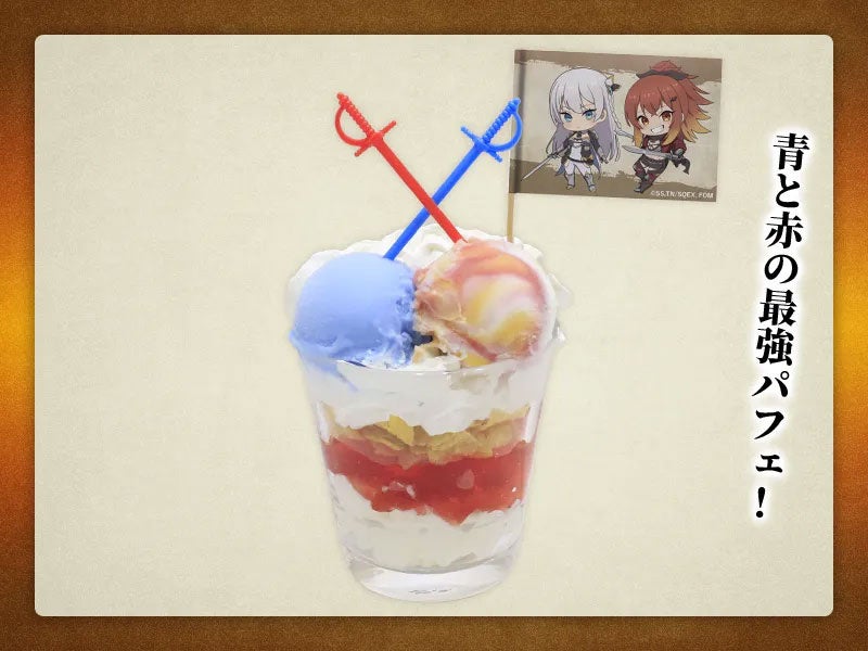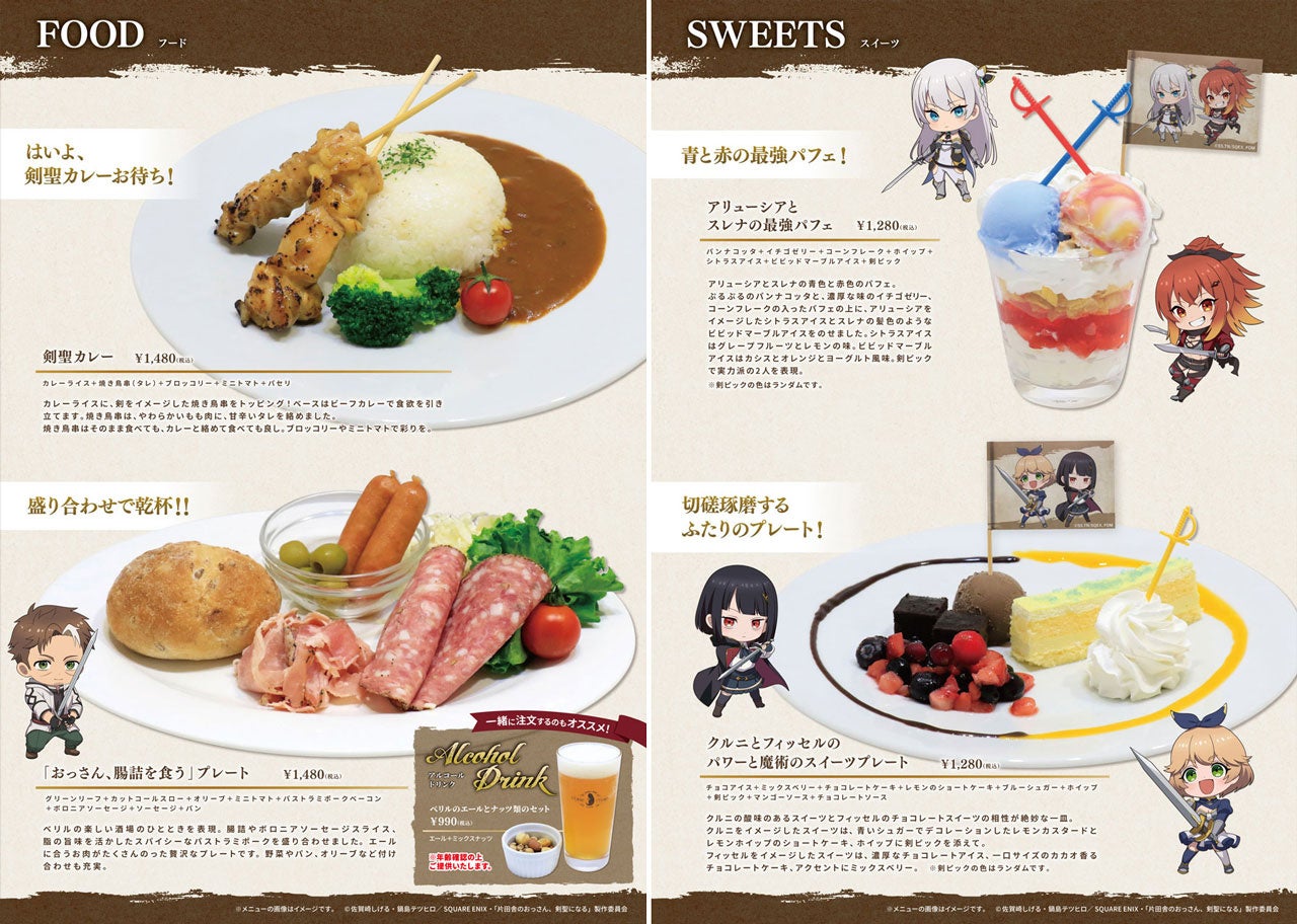 「剣聖カレー」や、ベリルの楽しい酒場のひとときを表現した「「おっさん、腸詰を食う」プレート」をはじめ、「アリューシアとスレナの最強パフェ」「クルニとフィッセルのパワーと魔術のスイーツプレート」など、ベリルやアリューシアたちをイメージしたコラボメニューがラインナップ。