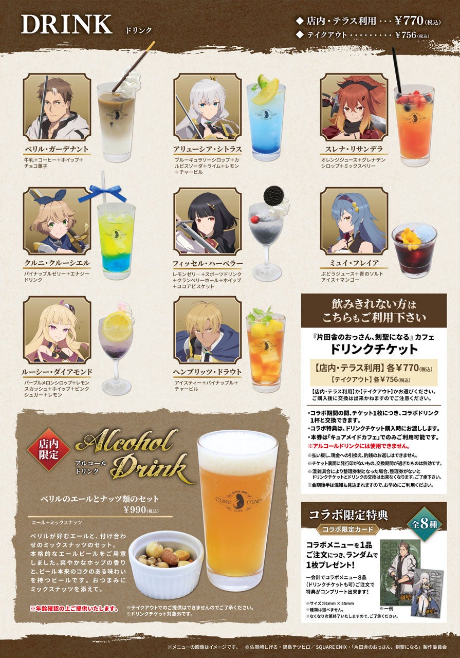 メニューはもちろん、特典、グッズなど、『片田舎のおっさん、剣聖になる』の世界観やキャラクターたちでいっぱいなコラボカフェをぜひお楽しみください。