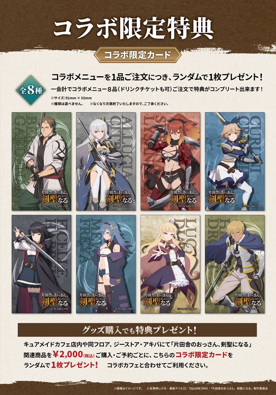 CURE MAID CAFÉ(キュアメイドカフェ)店内や同フロア、ジーストア・アキバ、にて『片田舎のおっさん、剣聖になる』関連商品を2,000円(税込)ご購入・ご予約ごとに、カフェで配布している【コラボ限定カード】をランダムで1枚お渡しします。