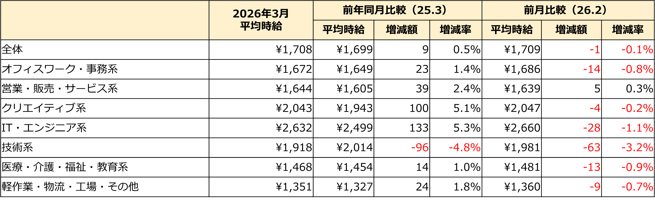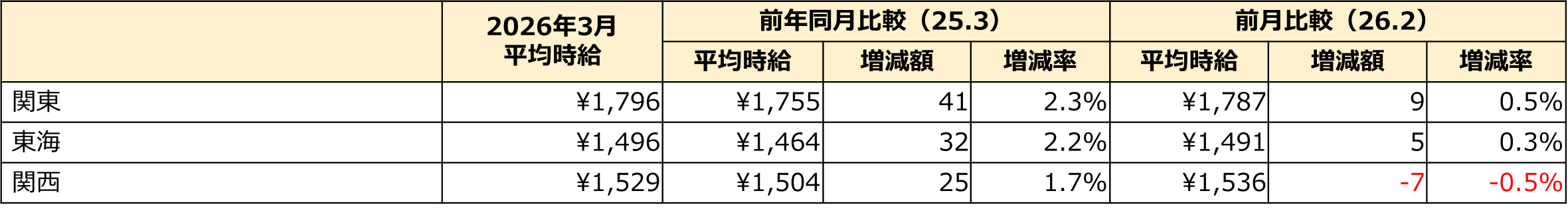 2026年3月度の三大都市圏平均時給は1,708円(前月比-1円・0.1%減、前年同月比+9円・0.5%増)でした。前年同月を上回るのは42ヵ月連続です。